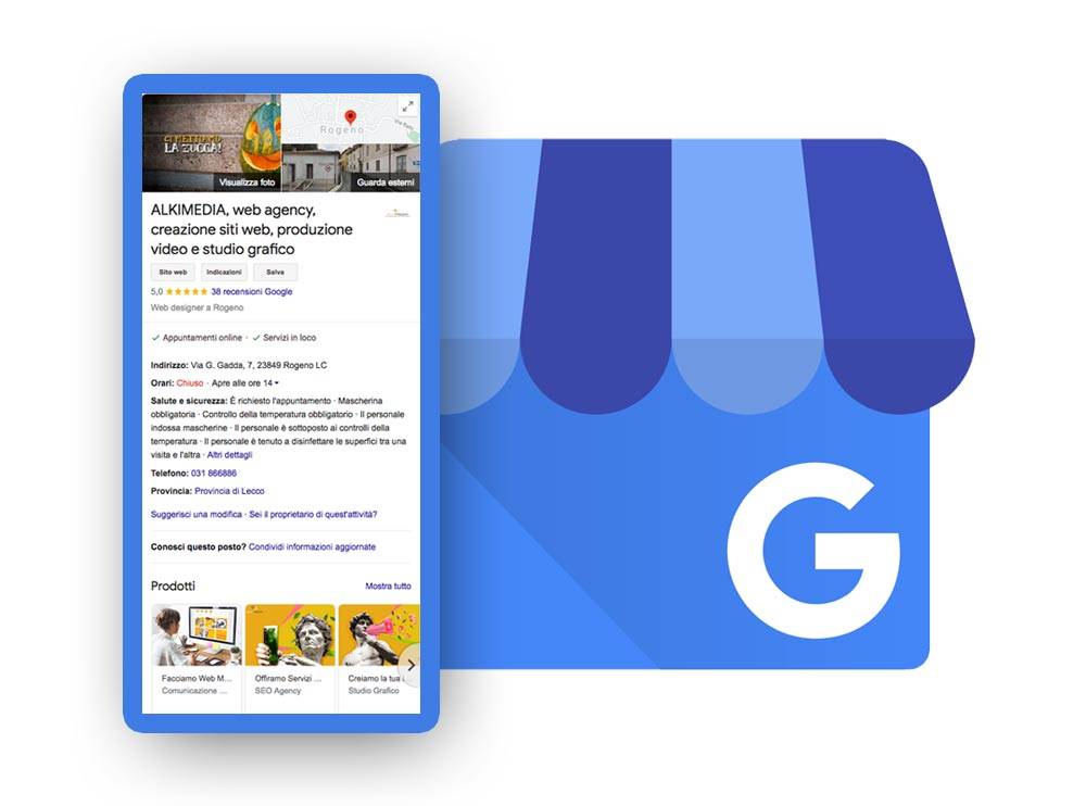 È la tua carta d’identità aziendale su Google. Quando qualcuno cerca il nome della tua impresa sul motore di ricerca, è la scheda che compare sulla destra, in bellavista. Contiene – potenzialmente! – tutte le informazioni necessarie e immediate di cui un cliente ha bisogno nel momento in cui decide di rivolgersi a te: dove ti trovi su Google Maps, qual è il tuo numero di telefono, giorni e orari di apertura, i servizi principali che offri, il link diretto al tuo sito aziendale.
